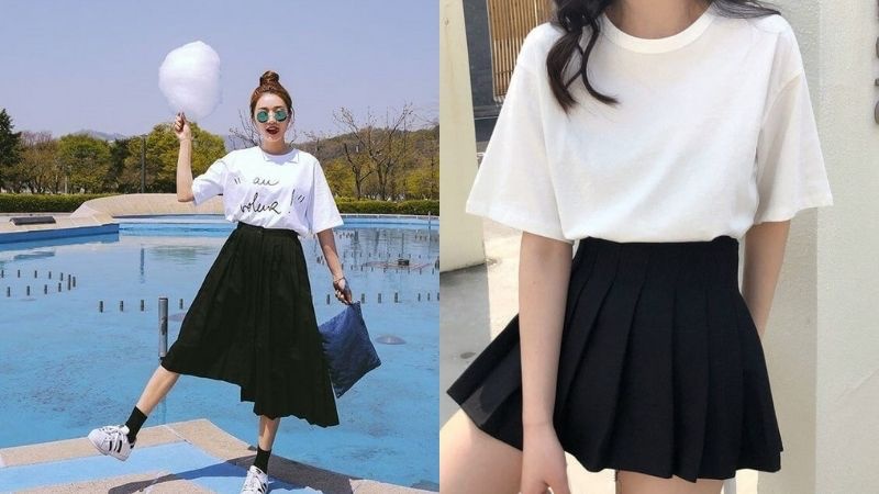 Ngoài ra, nếu muốn trông nữ tính hơn trong những buổi đi chơi hay hẹn hò, bạn có thể chọn chân váy đen dáng xòe cùng áo phông size lớn. Để hoàn thiện cho set đồ, hãy phối thêm giày sneaker và tất cao cổ. Những món đồ này đều mang lại sự trẻ trung, cá tính và năng động cho bạn.