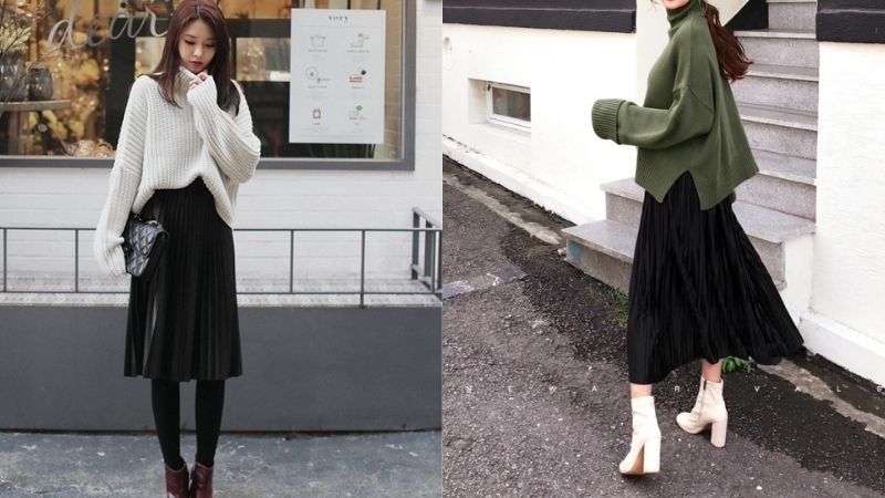 Phối một chiếc áo len đẹp yêu thích của mình cùng với chân váy đen là sự lựa chọn hoàn hảo cho những ngày se lạnh. Nếu chọn chân váy xòe đen, bạn sẽ thêm phần nữ tính và dịu dàng cho bộ trang phục.