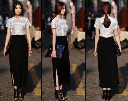 Nếu bạn là cô nàng nấm lùn và vẫn muốn mặc chân váy dài đen, hãy chọn đôi cao gót để nâng tầm bộ đồ. Cùng với áo thun trơn, bạn sẽ có bộ đồ đơn giản nhưng đem lại hiệu quả cao. Để luôn ấn tượng và xinh đẹp, hãy cập nhật xu hướng thời trang thường xuyên.