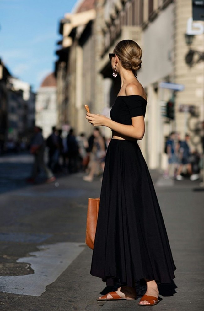 Sự phối hợp giữa chân váy maxi đen dài và áo trễ vai tạo nên một bộ đồ quyến rũ và hấp dẫn, giúp bất kỳ cô gái nào trông thật nổi bật và gợi cảm. Đây là một gợi ý tuyệt vời cho những cô nàng muốn diện trong các hoạt động dạo phố hay đi biển.