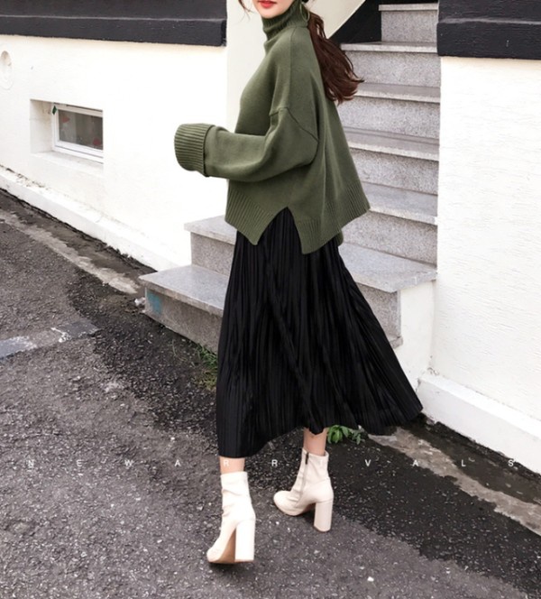 Một cách mix đồ khác với chân váy đen dài giúp các nàng nổi bật hơn giữa đám đông là kết hợp với chiếc áo len dáng rộng. Nếu các nàng ưa thích phong cách trẻ trung, năng động và phá cách, thì bộ đôi này đáng để thử.