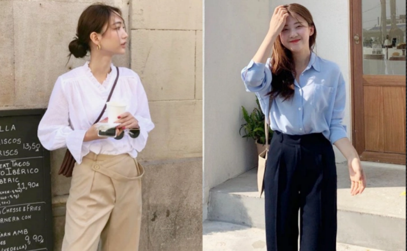 1. Phối quần ống rộng công sở và áo sơ mi kiểu