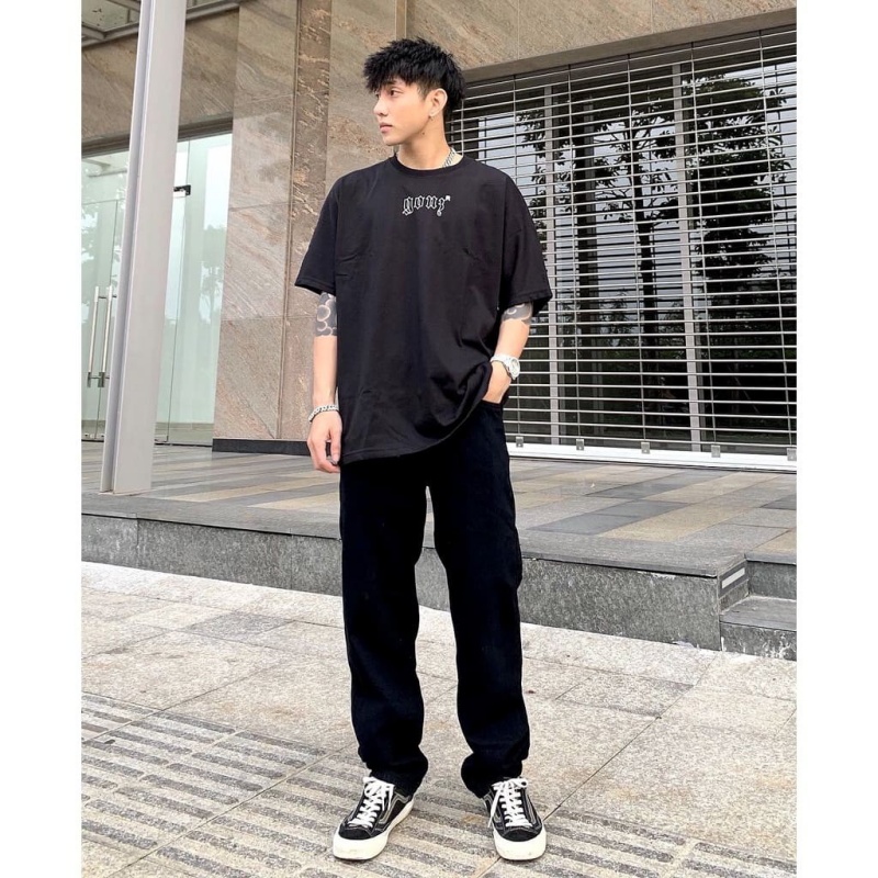 - Quần jean ống rộng nam + áo phông oversize