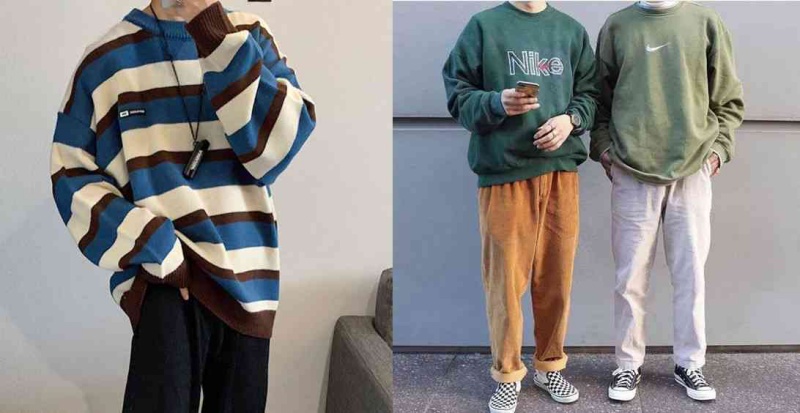 - Quần jean ống rộng nam mix áo pull retro