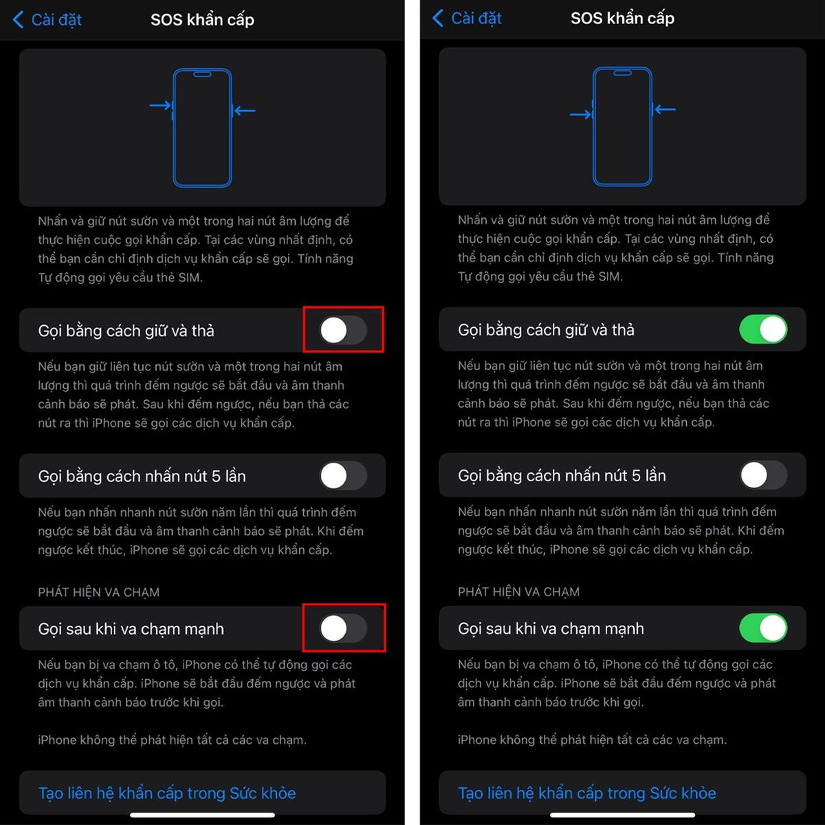 Bước 2: Tại giao diện này, hãy bật các tính năng gọi SOS khẩn cấp lên.
