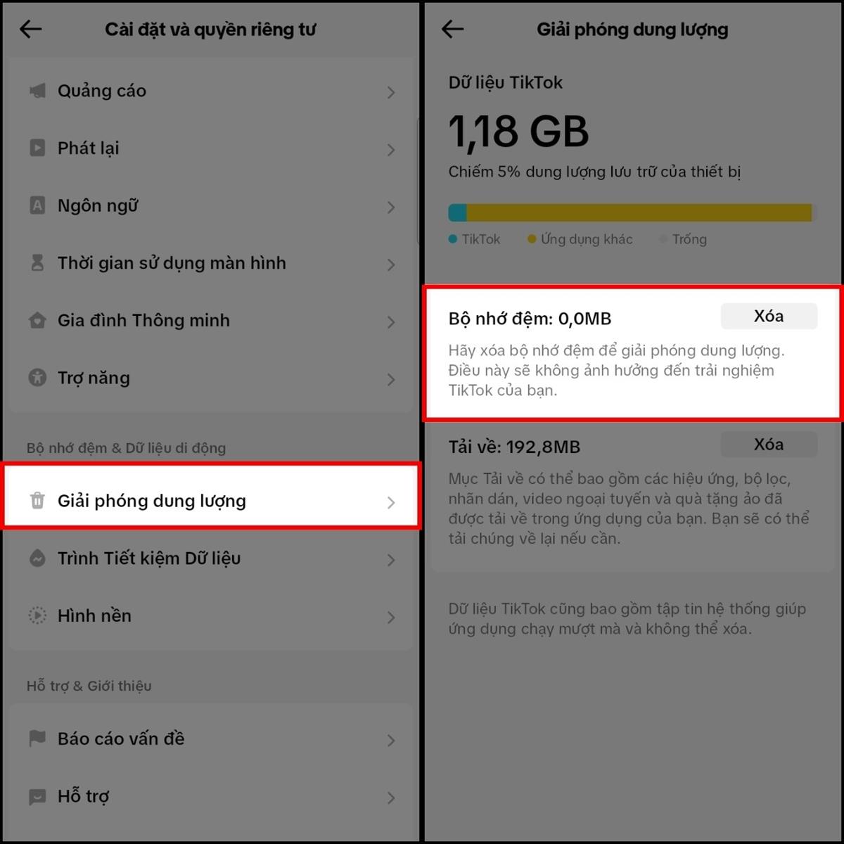 Để xóa bộ nhớ đệm, hãy chọn Cài đặt và quyền riêng tư > Lướt xuống và chọn vào mục Giải phóng dung lượng > Chọn Xóa bộ nhớ đệm để hoàn tất.