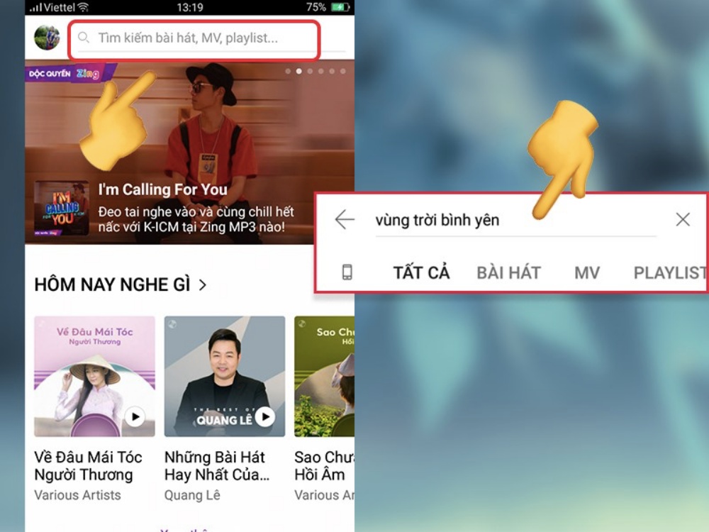 Bước 2: Sau đó, bạn mở ứng dụng Zing MP3 lên -> Nhập tên bài hát muốn tải ở khung tìm kiếm
