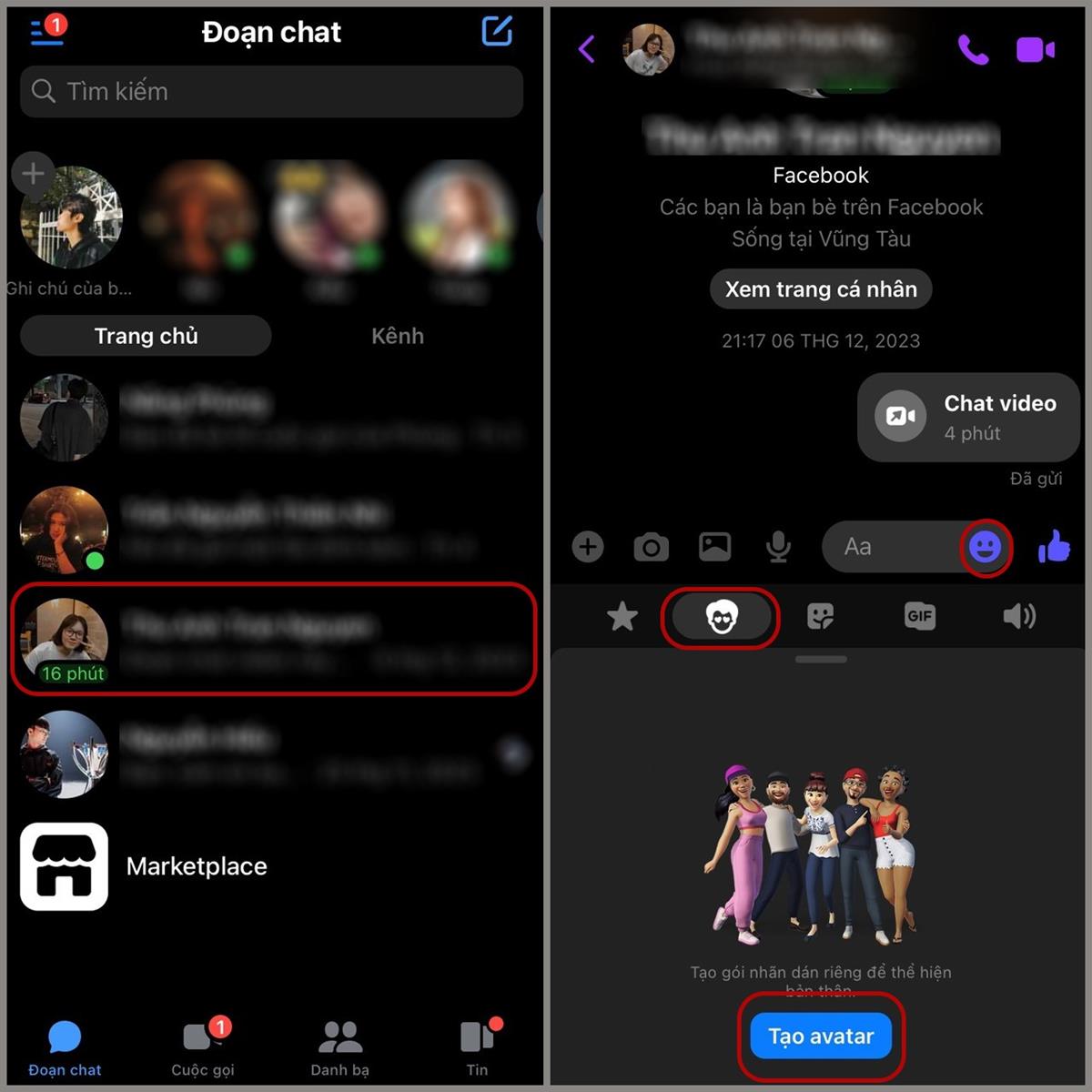 Bước 1: Đầu tiên, hãy truy cập ứng dụng Messenger trên điện thoại > Chọn người dùng tùy chọn > Nhấn chọn biểu tượng Nhãn dán > Nhấn chọn biểu tượng Avatar >Nhấn chọn Tạo Avatar.