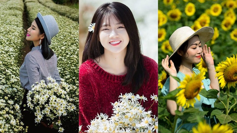 Bạn có thể tham khảo một số kiểu tạo dáng như: Ôm hoa trong tay, hơi ngửa mặt lên trời và nhắm mắt, tay cầm vành mũ và ngậm một bông hoa, lấy hoa che mắt, tạo dáng ngửi từng cánh hoa, hay đơn giản là ôm bó hoa rồi nhìn thẳng vào ống kính.