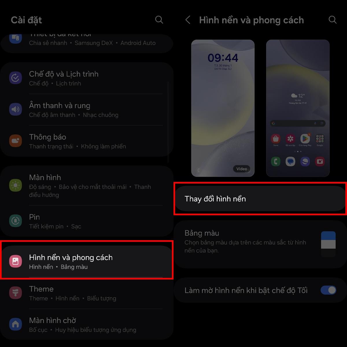 Bước 1: Đầu tiên mở ngay phần cài đặt hệ thống thông qua các icon, phím tắt trên màn hình. Tiếp theo, lướt xuống và tìm chọn mục Hình nền và phong cách > Chọn tiếp Thay đổi hình nền.