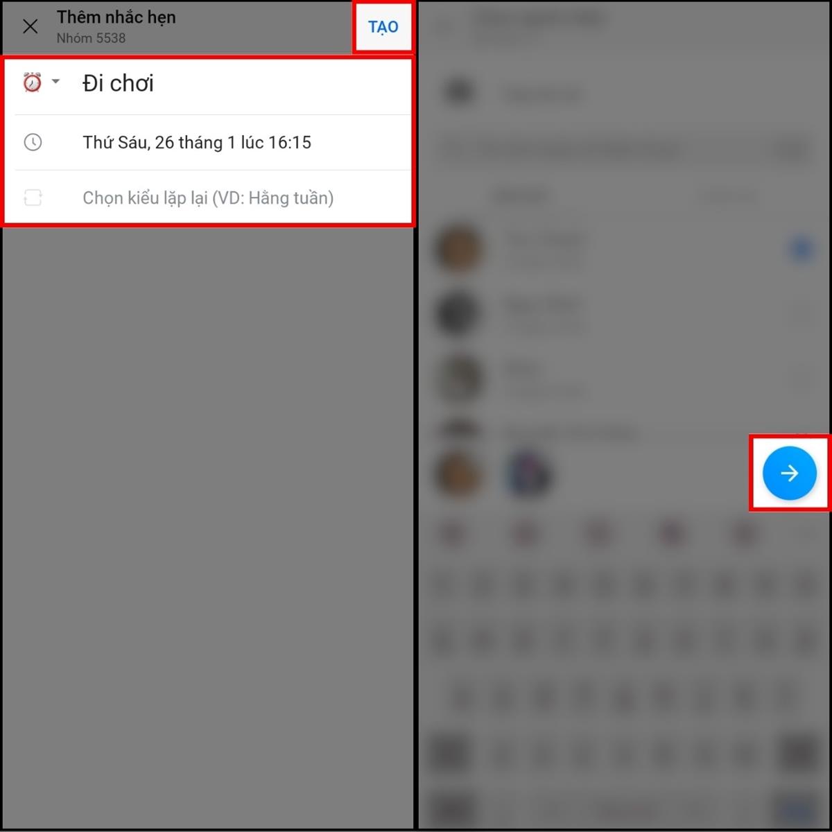 Bước 2: Tiếp theo hãy lựa chọn giờ hẹn với bạn bè > Nhấn Tạo để bắt đầu tạo một cuộc hẹn mới > Bạn lựa chọn hai người bạn trở lên để cùng tham gia lịch hẹn với mình > Chọn dấu mũi tên để tạo nhóm mới cho cuộc hẹn là hoàn thành.