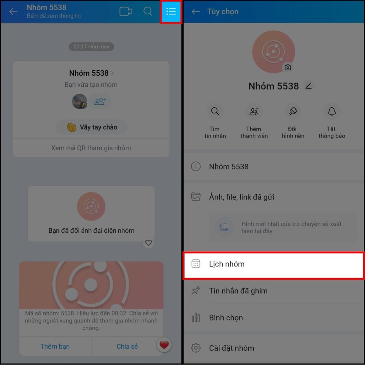 Bước 1: Đầu tiên hãy lựa chọn nhóm mình muốn lên lịch hẹn > Nhấn chọn vào biểu tượng ba dấu gạch ngang ở góc phải màn hình > Nhấn chọn Lịch nhóm để bắt đầu lên lịch hẹn nhé.