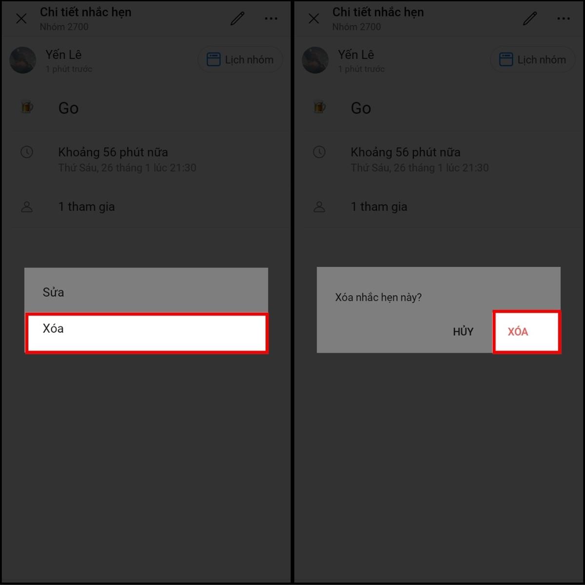 Bước 2: Tiếp tục, hãy nhấn chọn Xóa > Xác nhận Xóa để xóa nhắc hẹn đã tạo là hoàn thành.