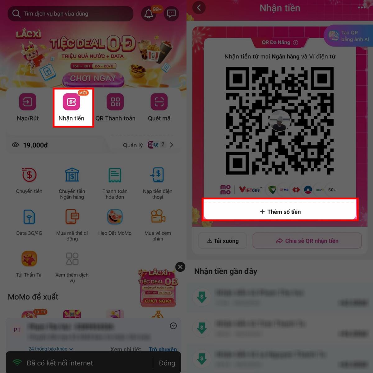 Tiếp theo, bạn sẽ thấy được mã QR nhận tiền của mình và bên dưới đó sẽ có một nút Thêm số tiền, ấn vào đó