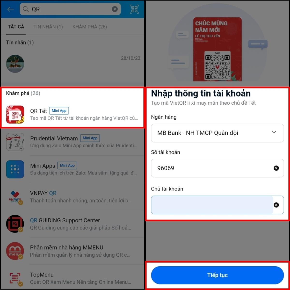 Bước 1: Hãy truy cập vào ứng dụng Zalo > Gõ từ khóa QR Tết trên thanh tìm kiếm > Nhấn chọn mini app QR Tết xuất hiện đầu tiên > Sau đó, hãy chọn Ngân hàng mình đang sử dụng, nhập vào thông tin Số tài khoản và Tên tài khoản > Chọn Tiếp tục để tạo mã QR Tết cho mình nhé.