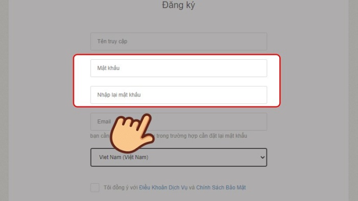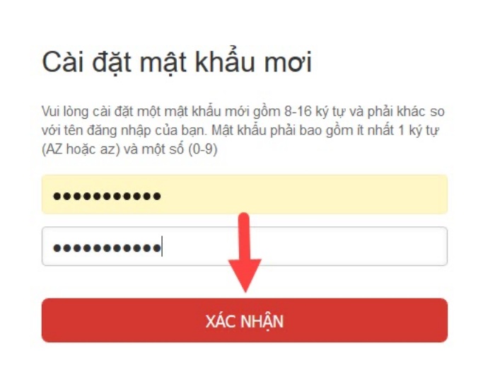 *Lưu ý: Mật khẩu của bạn phải đảm bảo: độ dài 8-16 ký tự, ít nhất 1 chữ cái (a-z hoặc A-Z) và 1 chữ số, và không giống với tên tài khoản.