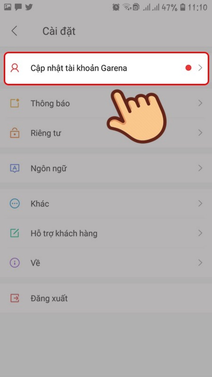 Bước 12: Tiếp đó, bạn chọn Cài đặt -> Ấn Cập nhật tài khoản Garena.