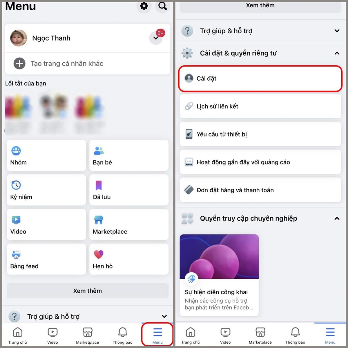 Bước 1: Đầu tiên mở ứng dụng Facebook > Tiếp theo chọn vào Menu > Tại mục Cài đặt & quyền riêng tư, hãy chọn vào Cài đặt.