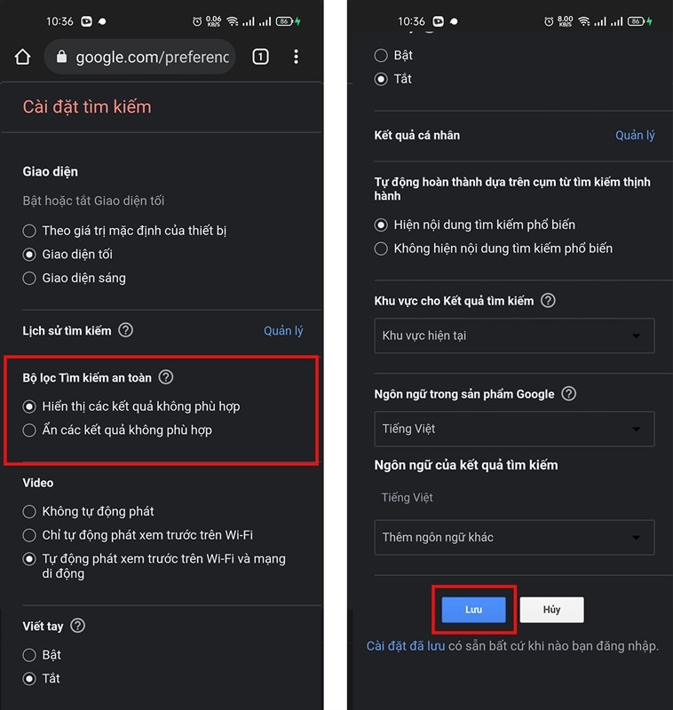 Bước 2: Tiếp theo, trong phần Bộ lọc Tìm kiếm an toàn -> Bấm chọn Hiển thị các kết quả không phù hợp -> Tiến hành cuộn xuống cuối trang để ấn nút Lưu là xong.