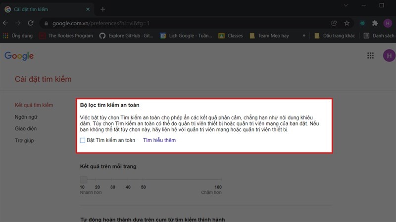 Bước 3: Tiếp theo, tick bỏ chọn Bật tìm kiếm an toàn trong phần Bộ lọc tìm kiếm an toàn.