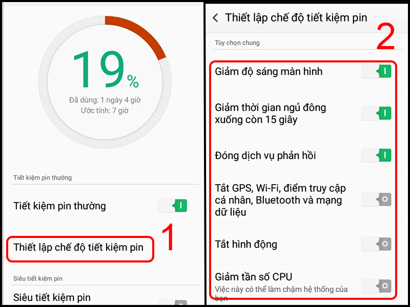 Bước 2: Tiếp theo, bạn chọn Thiết lập chế độ tiết kiệm pin và điều chỉnh các lựa chọn cho phù hợp với nhu cầu sử dụng. Người dùng nên bật các tùy chọn giảm độ sáng màn hình, giảm thời gian ngủ đông xuống còn 15 giây và đóng dịch vụ phản hồi để tối ưu hóa thời lượng pin mà vẫn đáp ứng được nhu cầu sử dụng điện thoại.