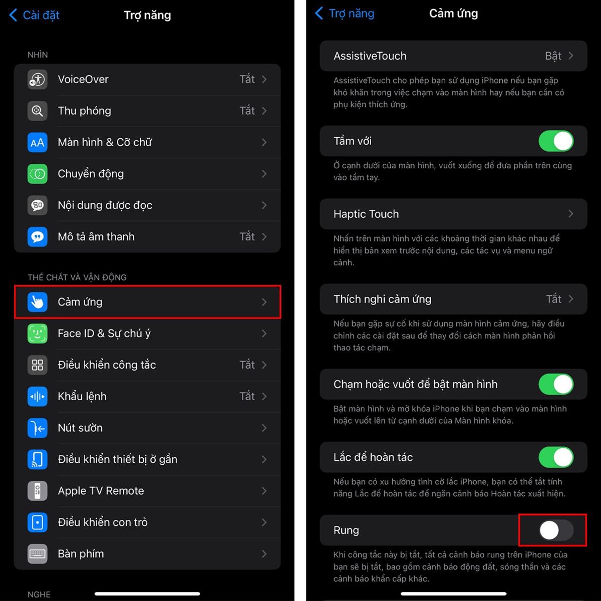 Bạn hãy truy cập vào Trợ năng nằm trong Cài đặt của máy > Chọn tiếp vào mục Cảm ứng > Chọn tiếp Tắt chế độ rung đi.