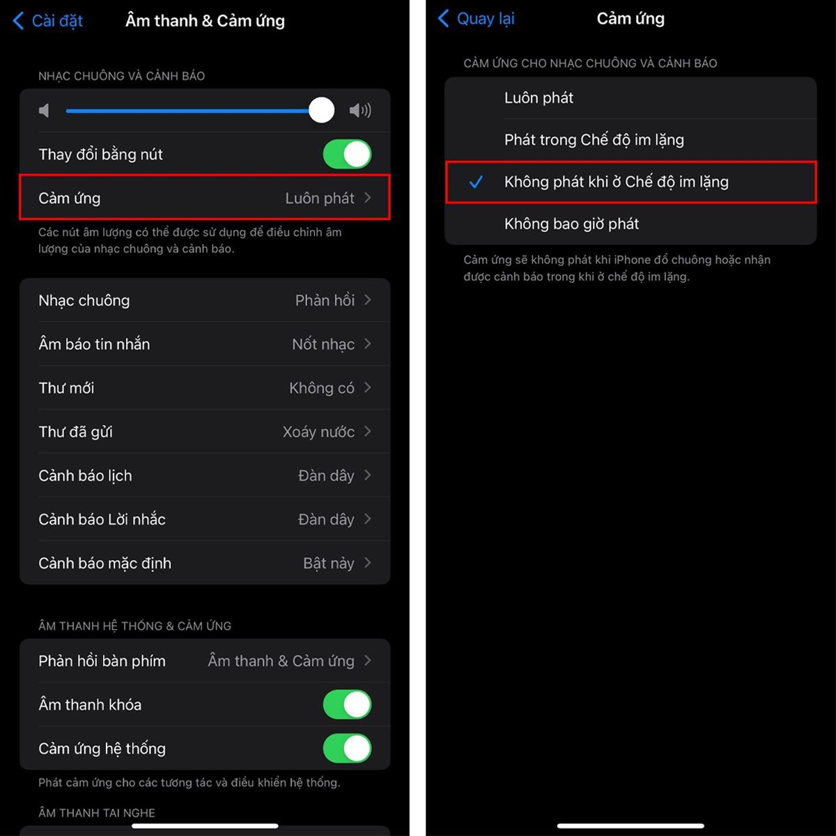 Bắt đầu, hãy truy cập vào Cài đặt của iPhone > Chọn tiếp vào mục Âm thanh & Cảm ứng > Chọn vào mục Cảm ứng > Tại đây, hãy chọn vào Không phát khi ở Chế độ im lặng.