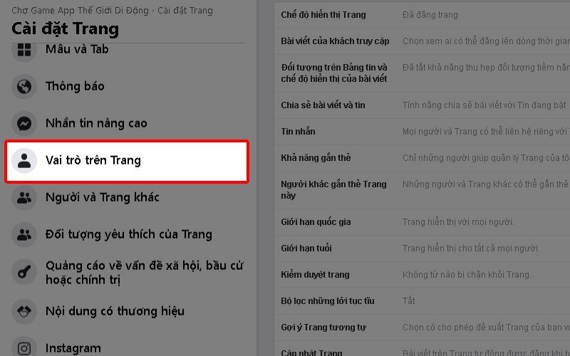 Bước 2: Tiếp theo, bạn nhấn chọn Cài đặt -> Click chọn mục Vai trò trên trên Trang.