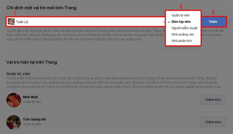 Bước 4: Tiếp đó, tại mục Chỉ định một vai trò mới trên trang, bạn tiến hành nhập Tên hoặc email (1) người mà bạn muốn phân quyền -> Nhấn chọn Vai trò (2) của người được phân quyền -> Click chọn Thêm (3).