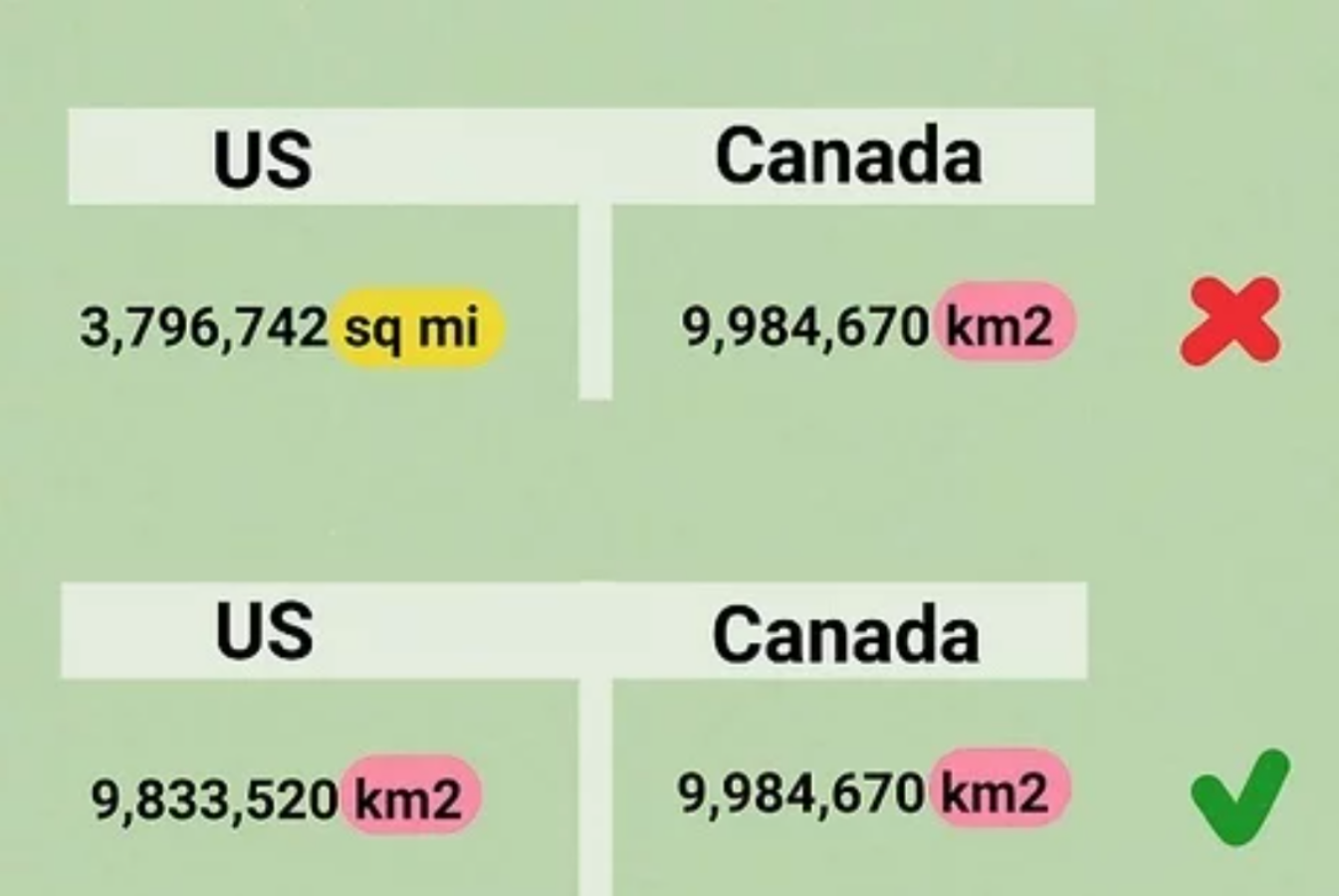 Giả sử: Một nước có diện tích theo dặm vuông, nước còn lại theo km2. Thì khi đó, bạn phải đổi diện tích chúng ra cùng đơn vị là dặm hay km2.