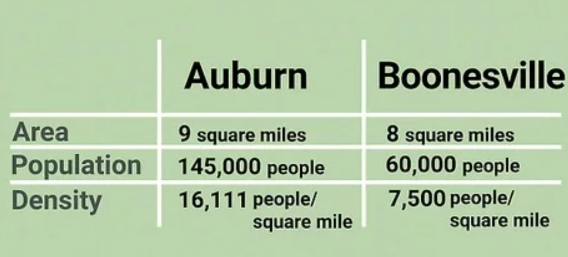 Mặc dù cách tính mật độ dân số ở trên đơn giản nhưng nó lại không thể tiết lộ nhiều chi tiết của khu vực. Vì nó phụ thuộc rất nhiều vào kích cỡ và loại khu vực bạn đang xem xét. Đôi khi nó lại phản ánh chính xác hơn về những khu vực nhỏ có dân cư đông đúc so với khu vực lớn có cả đất hoang.