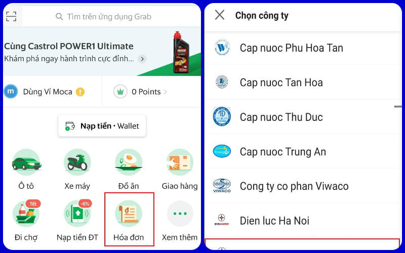 Bước 1: Đăng nhập vào ứng dụng Grab > Vào mục Hóa Đơn > Chọn Công ty cung cấp.