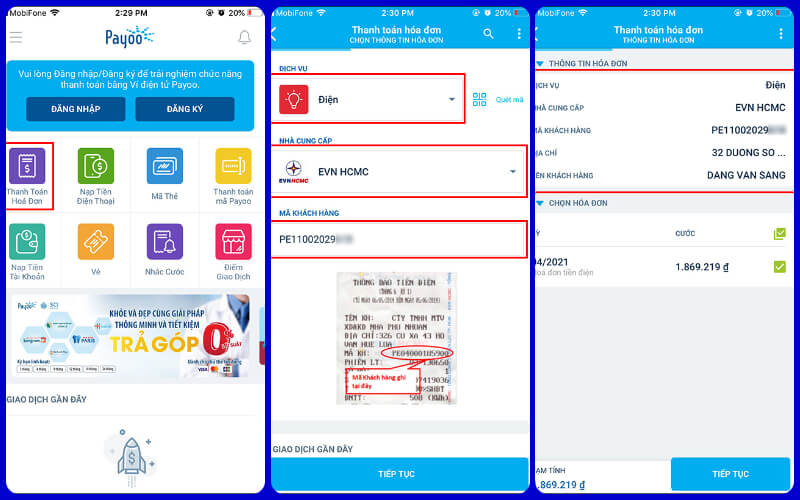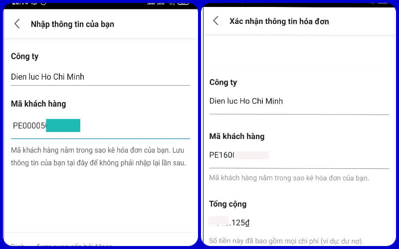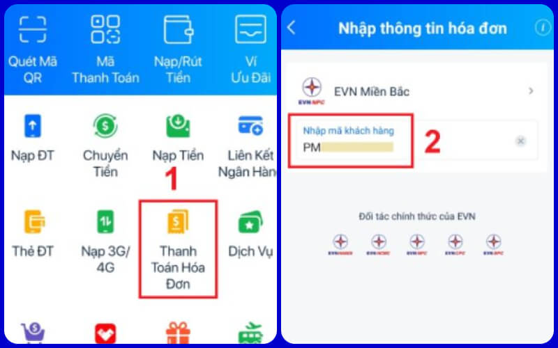 Bước 2: Nhập mã khách hàng > Chọn "Tiếp tục" > Kiểm tra thông tin hóa đơn tiền điện cần thanh toán > Chọn "Thanh toán".