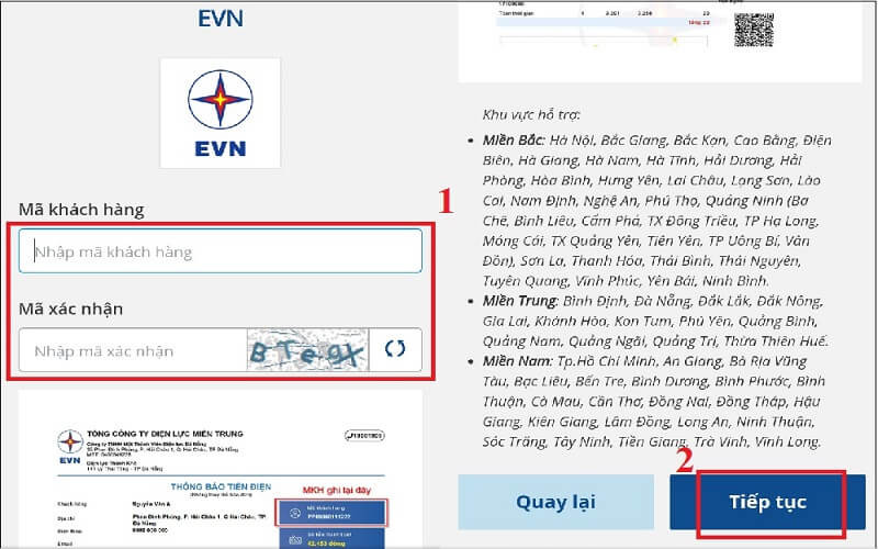 Bước 2: Nhập mã Khách hàng và mã Xác nhận => Chọn Tiếp tục để tra cứu và thanh toán tiền điện.
