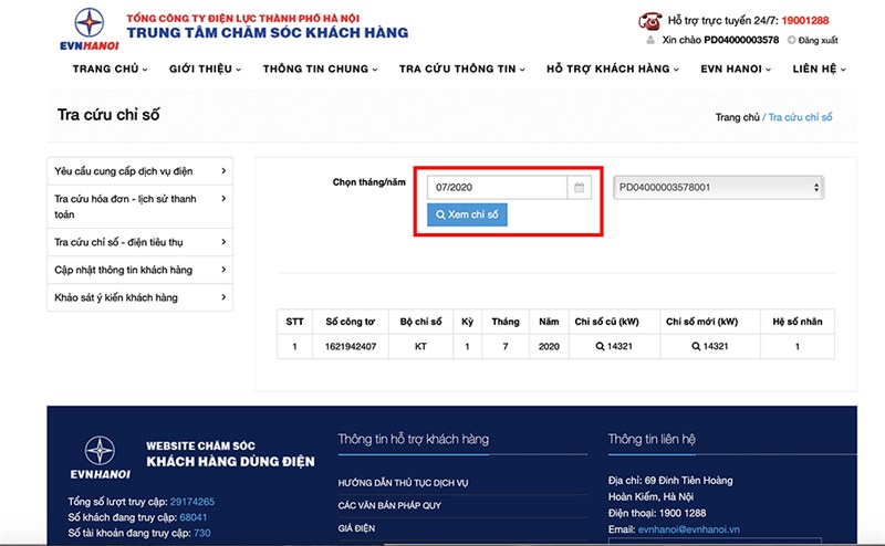 Bước 3: Hãy chọn tháng/năm muốn tra cứu và chọn “xem chỉ số” là xong.