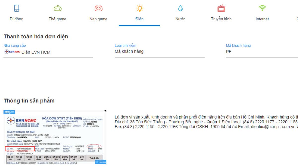 Bước 2: Nhập mã Khách hàng và chọn Nhập. Lúc này các thông tin hóa đơn tiền điện sẽ hiện thị.