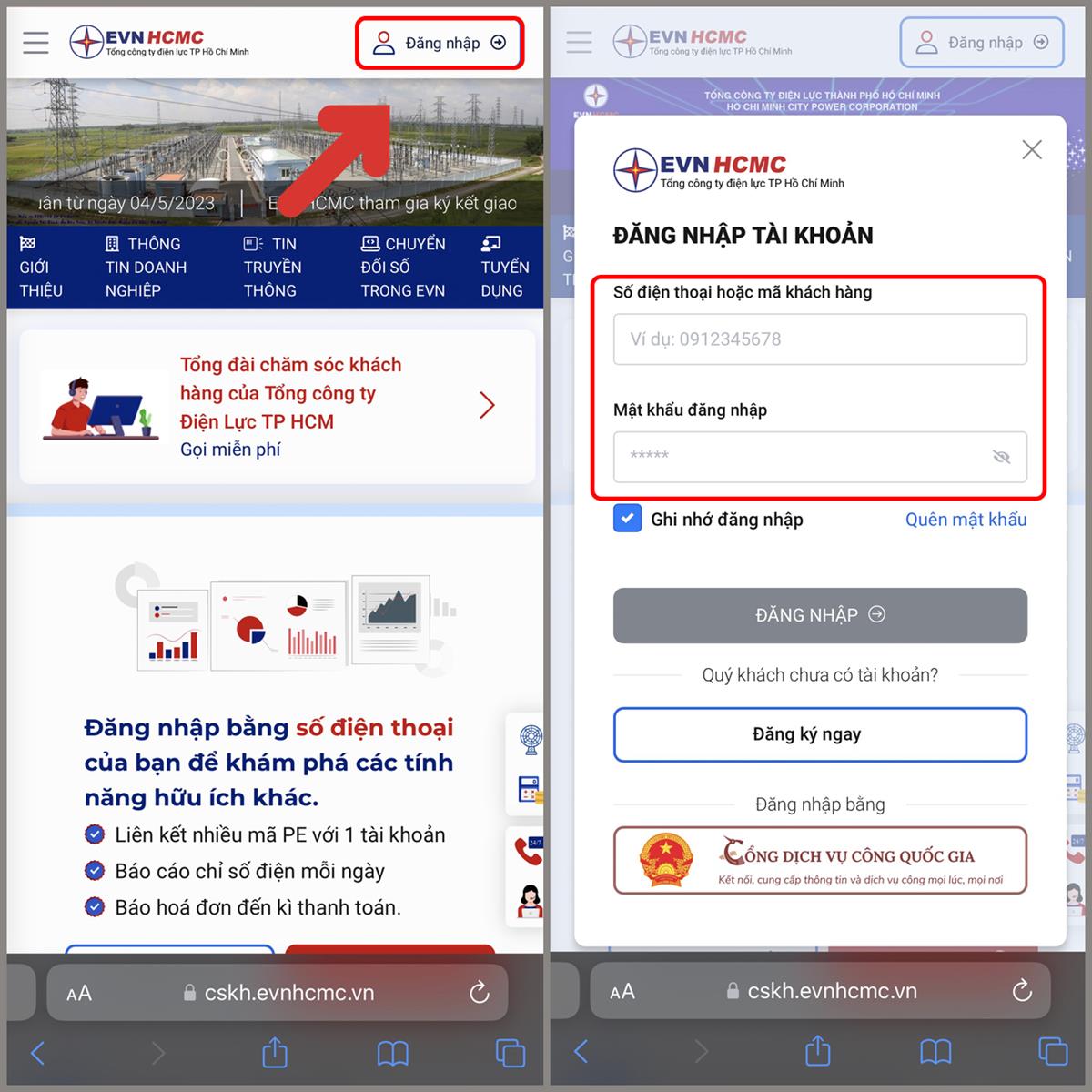 Bước 1: Đầu tiên, truy cập vào trang web chăm sóc khách hàng của EVN CSKH tùy theo khu vực mà bạn đang sinh sống > Nhấn Đăng nhập > Nhập thông tin đăng nhập.