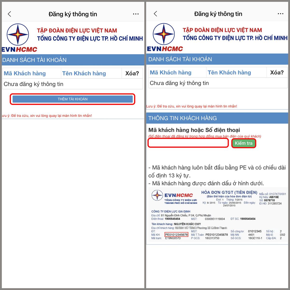 Tiếp tục, chọn “Thêm tài khoản, nhập mã khách hàng hoặc số điện thoại” > bấm kiểm tra.
