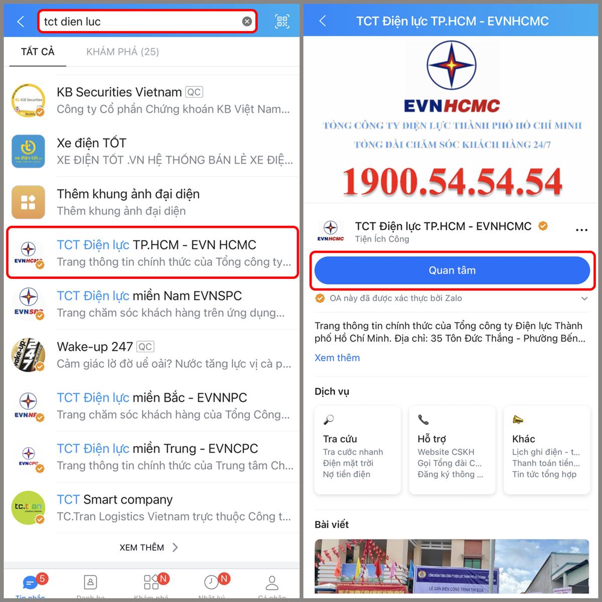 Bước 1: Mở ứng dụng Zalo lên và ở mục tìm kiếm, gõ TCT điện lực + tỉnh hoặc EVN + tỉnh, rồi tùy vào khu vực sinh sống > Chọn tra cứu tại khu vực đó (bao gồm: miền Nam, miền Bắc, miền Trung). Rồi nhấn vào nút “Quan tâm”
