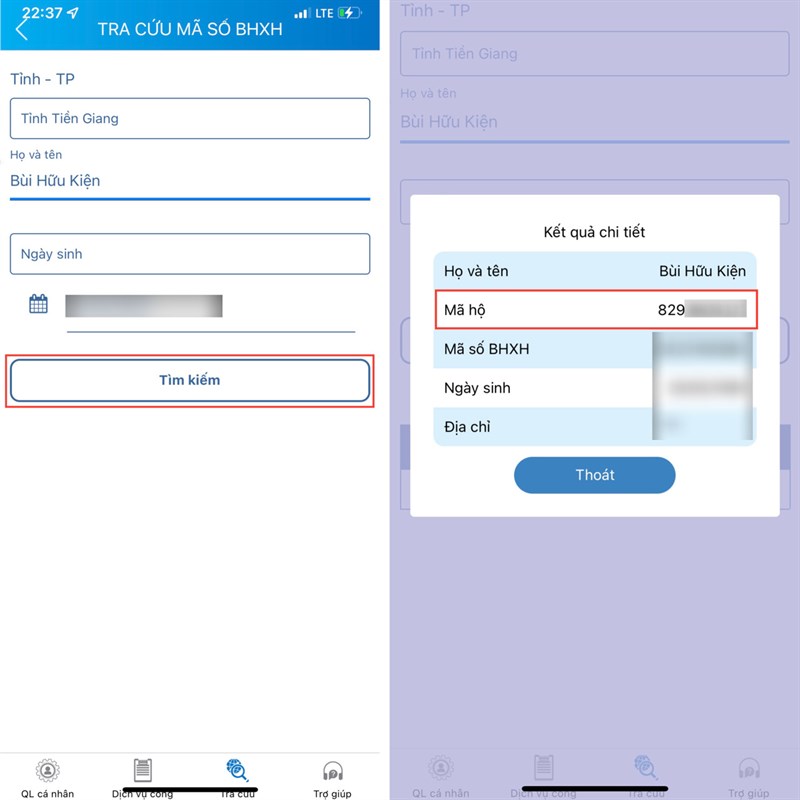 Bước 2: Ở giao diện này, hãy nhập vào tỉnh/thành phố của bạn đăng ký BHXH, sau đó nhập Họ tên và ngày tháng năm sinh. Tiếp tục, chọn vào Tìm kiếm. Sau ít phút hệ thống sẽ hiển thị kết quả mã hộ khẩu cho bạn.