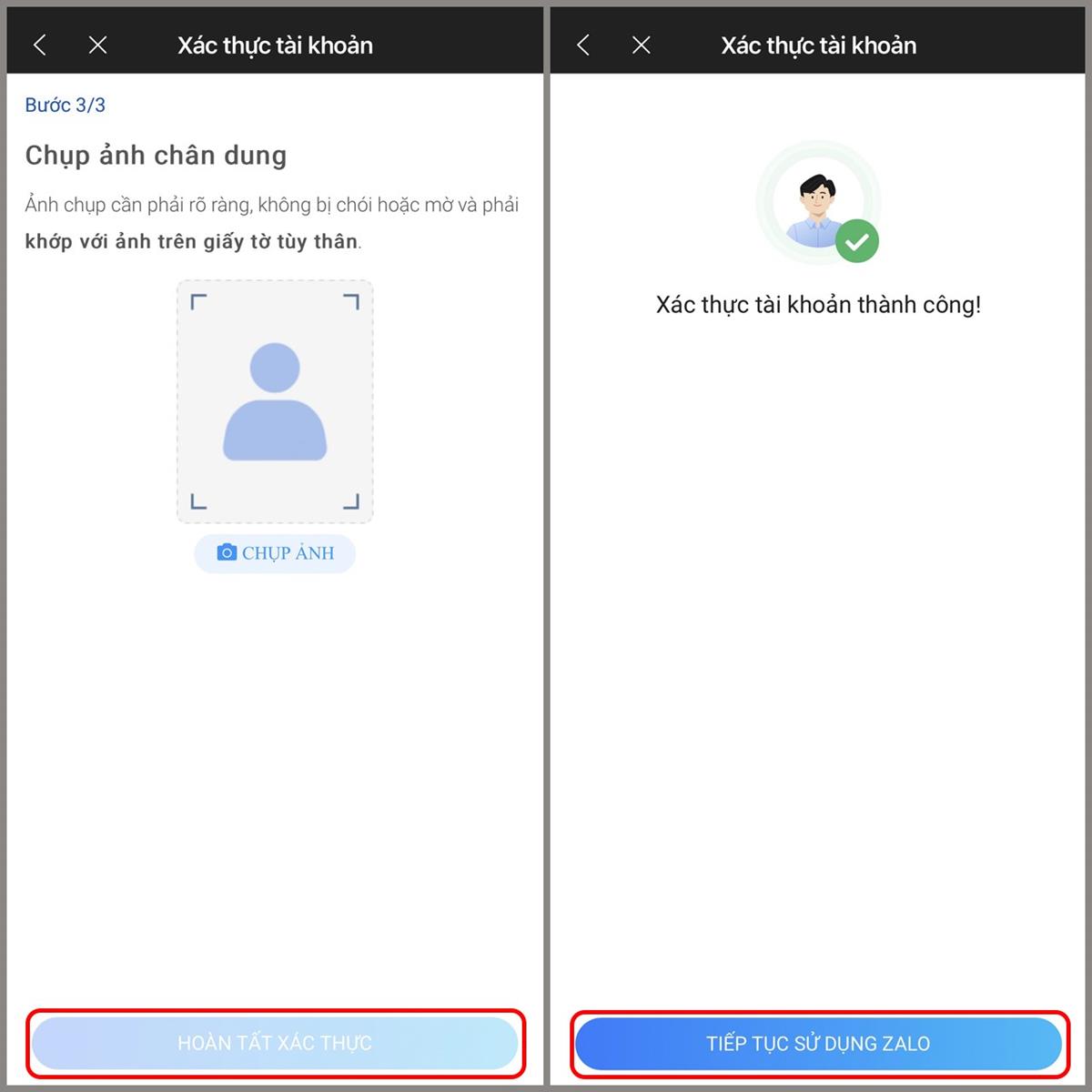 Tiếp theo, hãy chọn "Hoàn tất xác thực". Xác thực tài khoản thành công, Nhấn "Tiếp tục sử dụng Zalo".