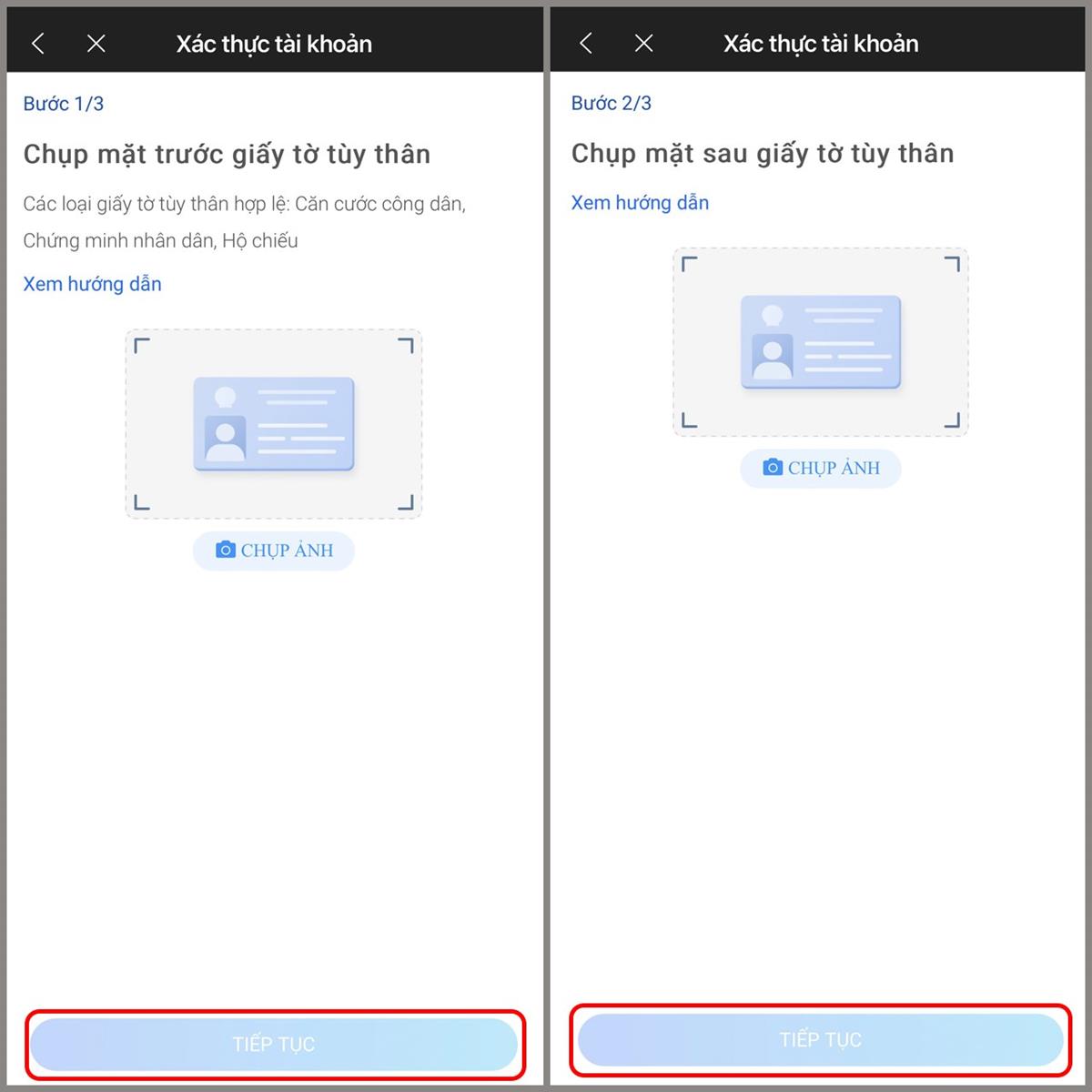 Bước 2. Chụp mặt trước và mặt sau giấy tờ tùy thân. Các loại giấy tờ tùy thân hợp lệ: Căn cước công dân (nên dùng), Chứng minh nhân dân hoặc Hộ chiếu.