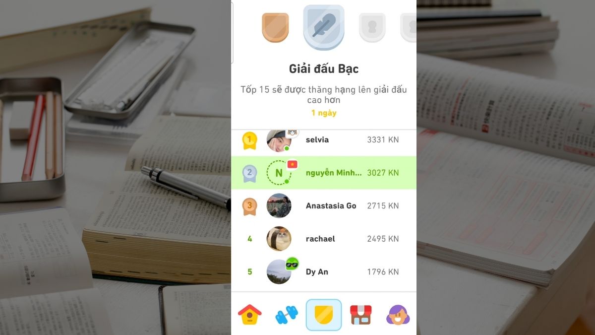 Bảng xếp hạng là một trải nghiệm học thú vị, nơi bạn tham gia giải đấu với cộng đồng Duolingo. Tính năng này hoạt động trên cả ứng dụng iOS/Android và trang web trên máy tính. Bạn phải tích điểm và leo lên bảng xếp hạng đó nha.