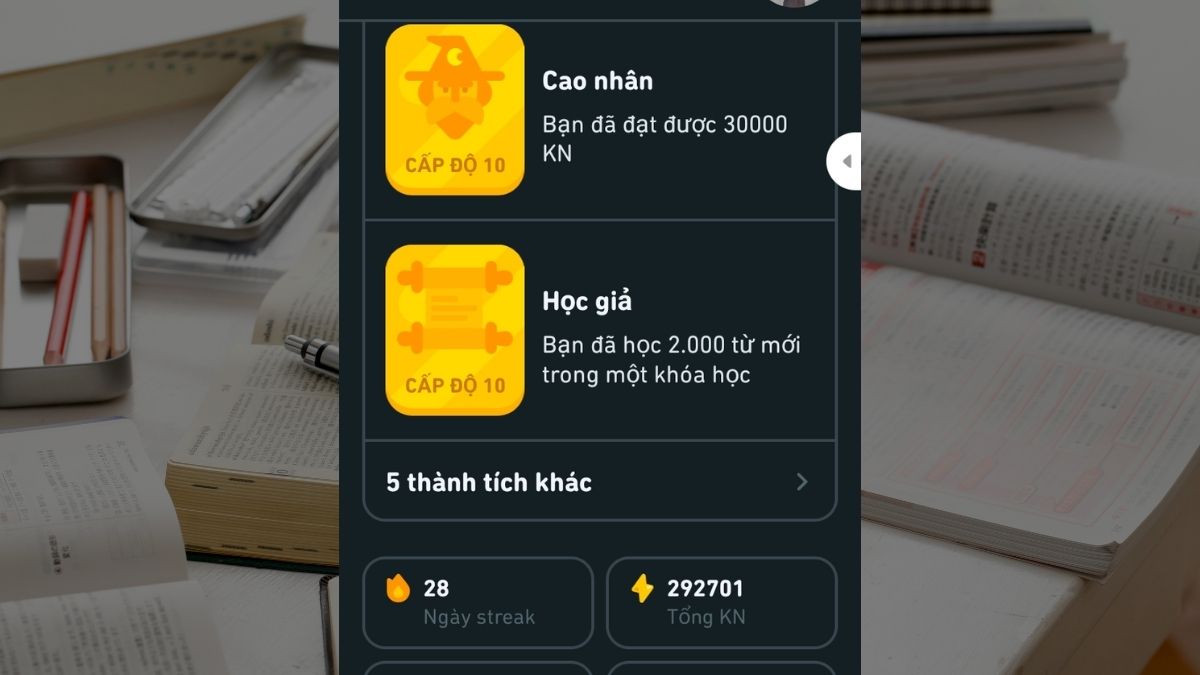 Thành tích "Cao nhân" đánh giá sự tiến bộ của bạn dựa trên số lượng điểm kinh nghiệm bạn đạt được. Bạn bắt đầu từ cấp độ 1 với 100 KN và có thể nâng cao đến cấp độ 10 với 30,000 KN. Điều này khích lệ người dùng không chỉ tham gia hoạt động học tập mà còn đối mặt với thách thức để đạt được điểm kinh nghiệm cao hơn.