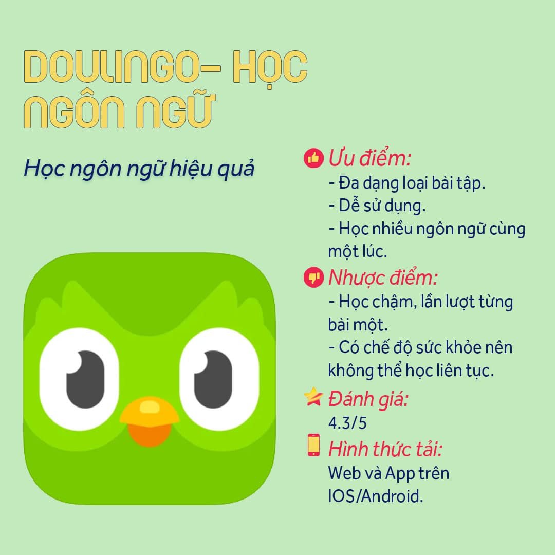 Điểm mạnh của Duolingo là kiến thức được sắp xếp hợp lí, dễ hiểu với mọi đối tượng. Từng bài học được để theo mức độ từ dễ đến khó, và có bài tập đi kèm theo. Không chỉ vậy, ứng dụng còn cho phép chúng mình được học nhiều ngôn ngữ khác nhau trên thế giới cùng một lúc mà lại hoàn toàn miễn phí nữa.