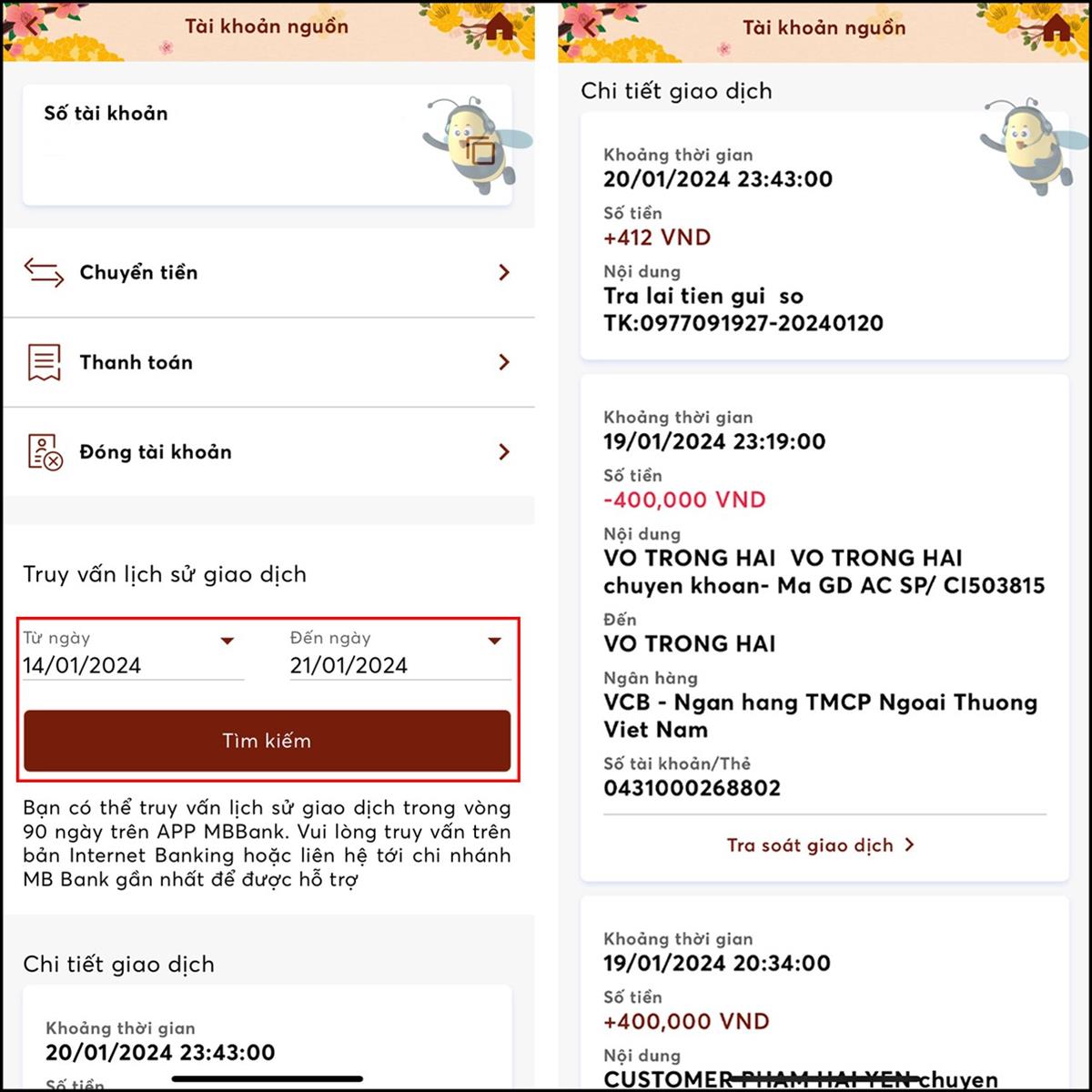 Bước 2: Nhấn vào tài khoản đang dùng > Chọn mốc thời gian muốn kiểm tra > Tìm kiếm > Vuốt xuống dưới sẽ thấy lịch sử giao dịch nha.