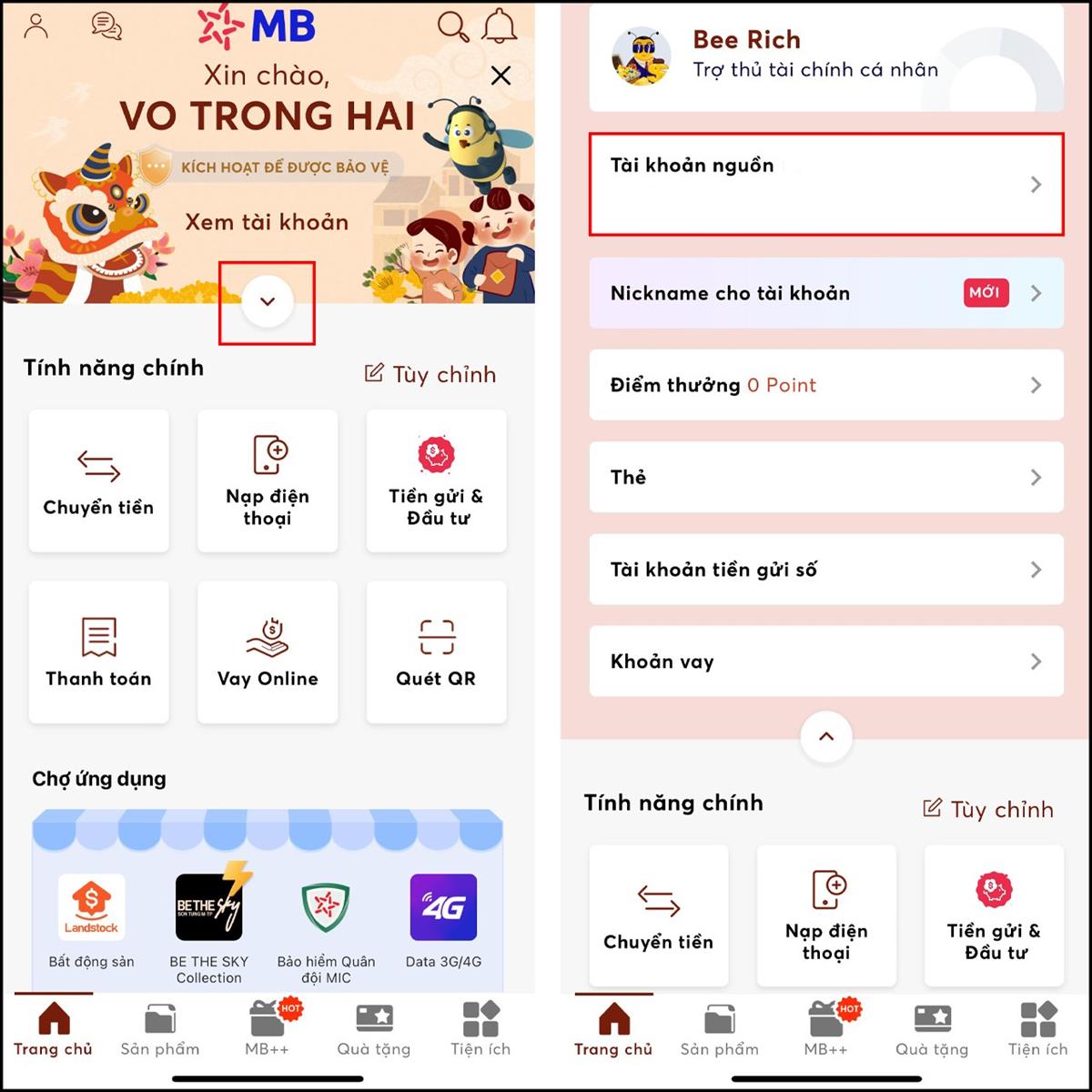 Bước 1: Đầu tiên, hãy truy cập vào ứng dụng MB Bank > Tại ngay giao diện chính > Chọn vào mũi tên tại Xem tài khoản > Chọn vào Tài khoản nguồn.