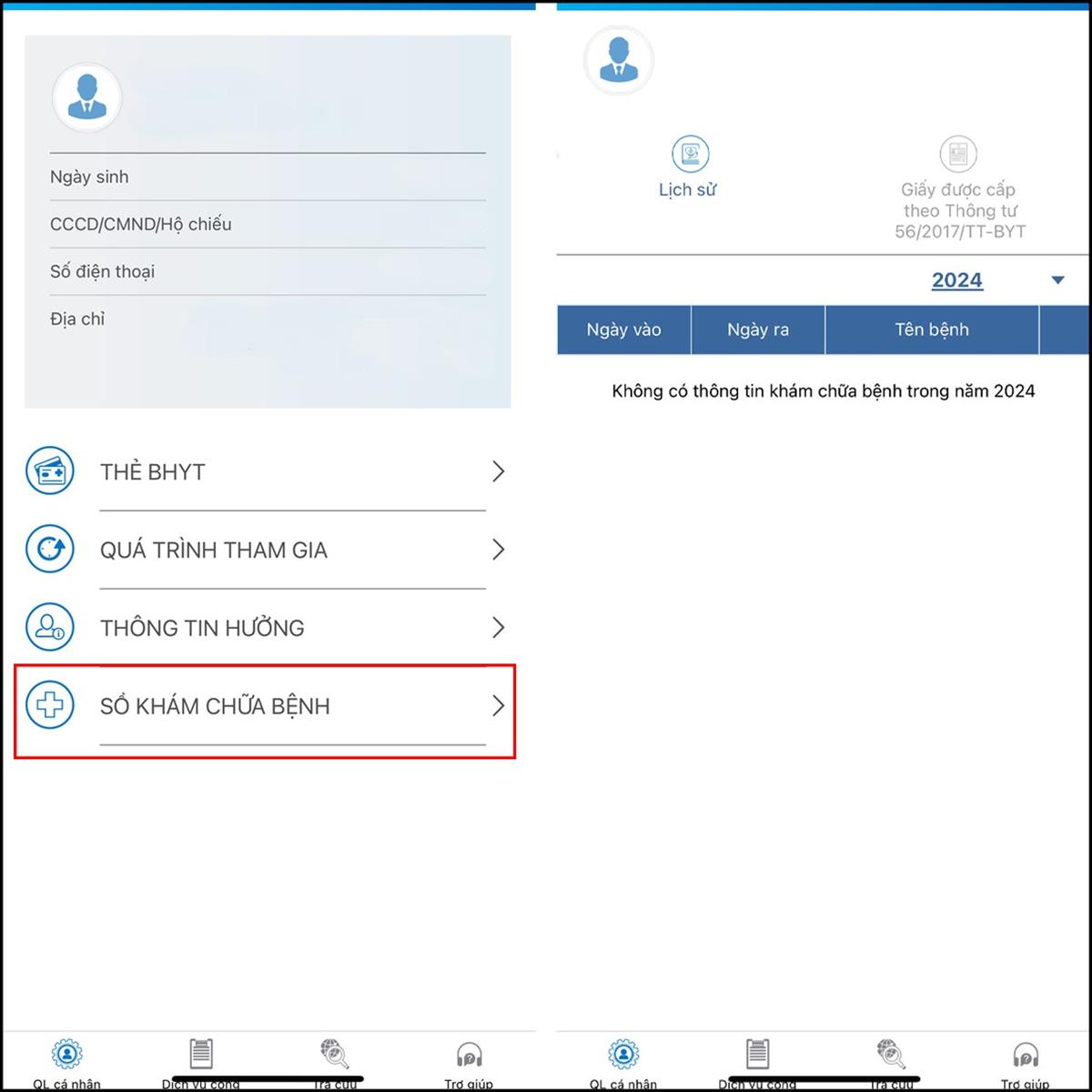 Bước 2: Ở góc bên trái ở phía dưới bên trái màn hình mục QL cá nhân > Sau đó, tiếp tục nhấn chọn vào mục Sổ khám chữa bệnh > Ngay lập tức hệ thống sẽ xuất hiện lịch sử khám chữa bệnh