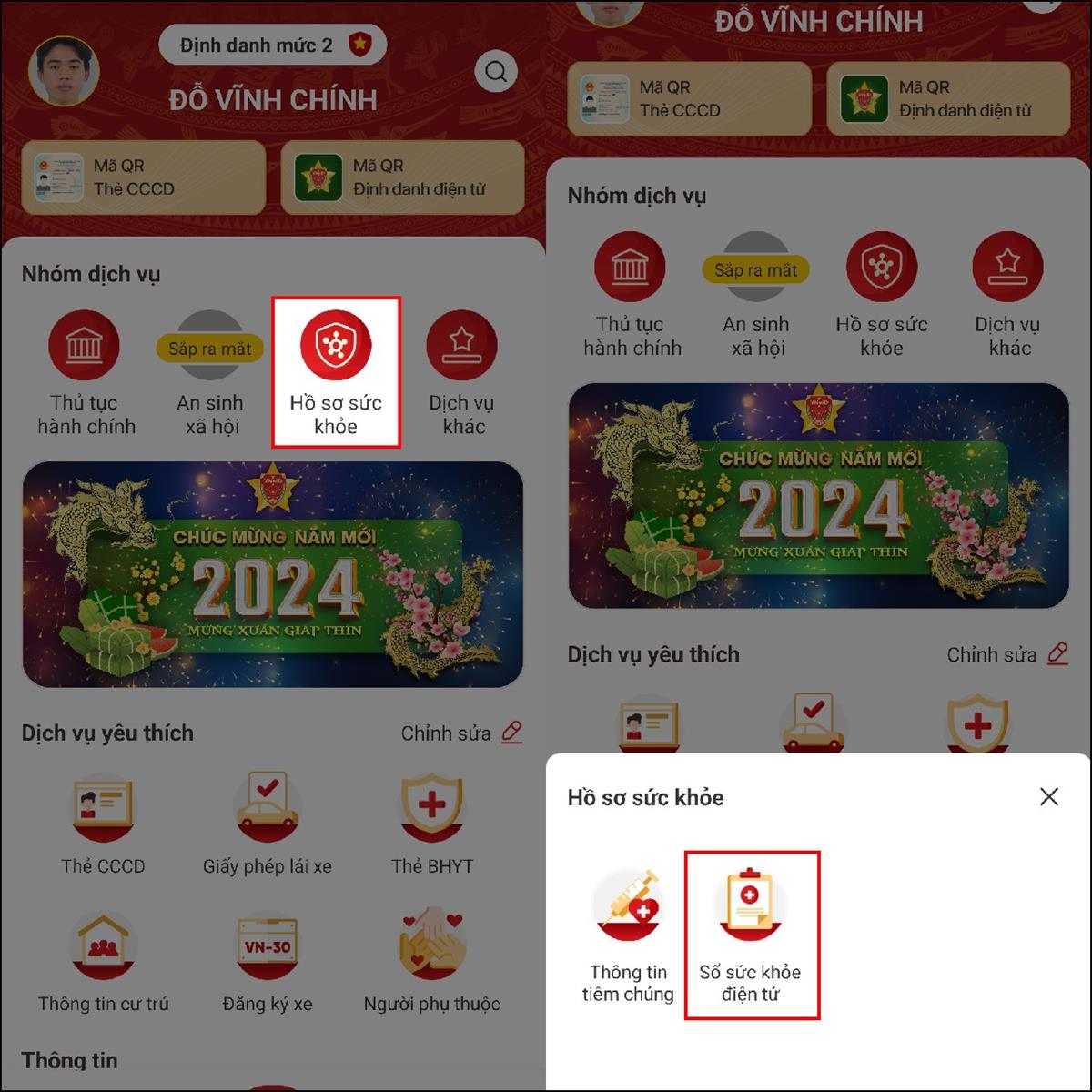 Bước 1: Tại giao diện chính của ứng dụng, chọn mục Hồ sơ sức khỏe ở Nhóm dịch vụ > Sau đó, hãy chọn Sổ sức khỏe điện tử ở phía dưới.