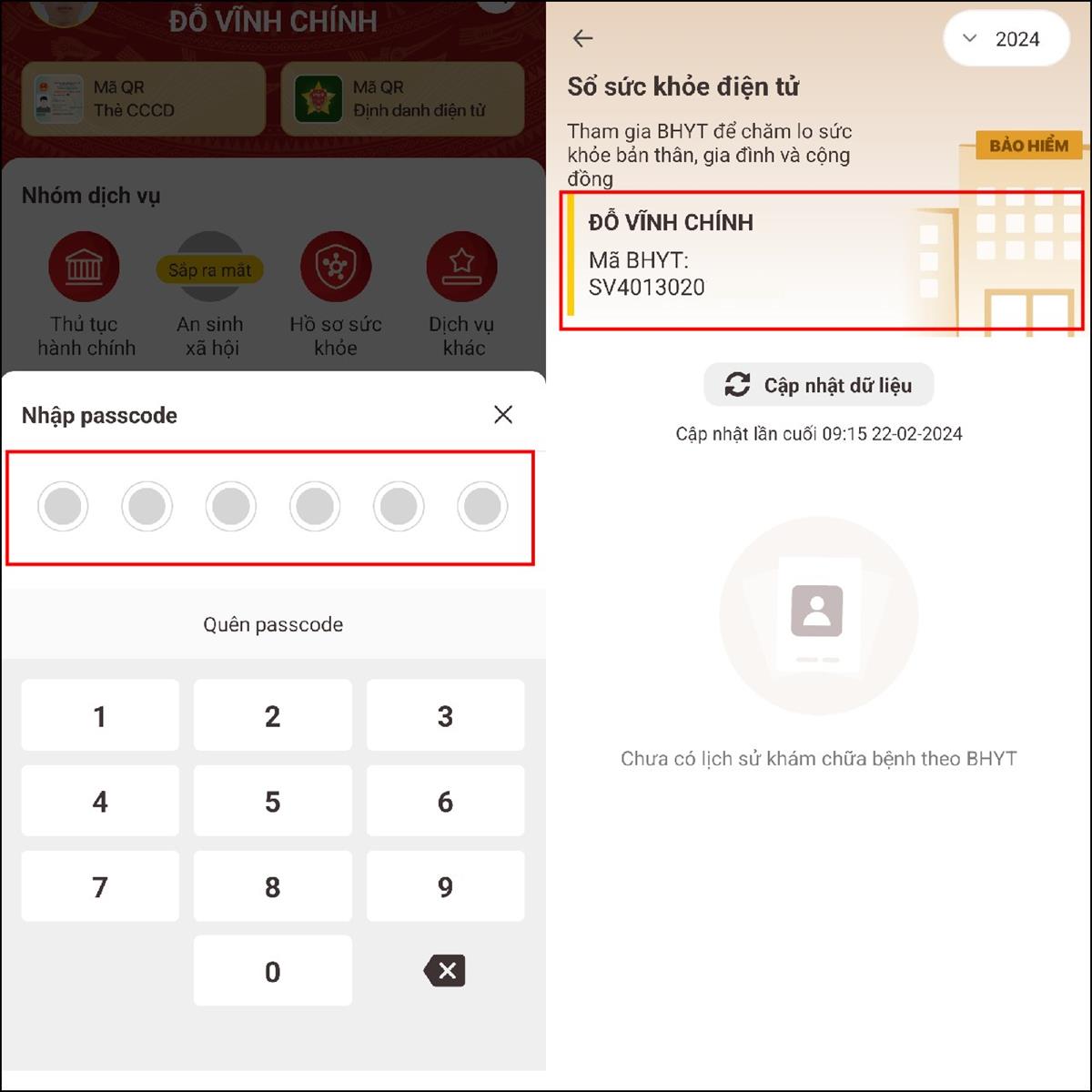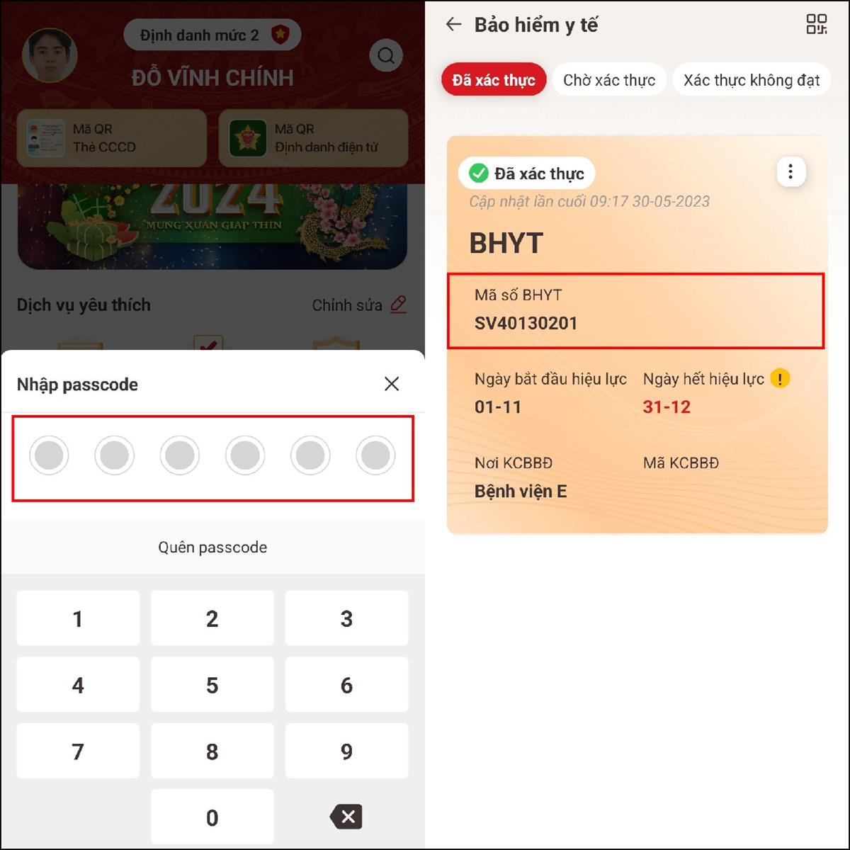 Bước 3: Tiếp theo, hãy nhập passcode của ứng dụng. Tất cả thông tin của thẻ bảo hiểm y tế sẽ có trong đây và bạn xem mã BHYT tại đây